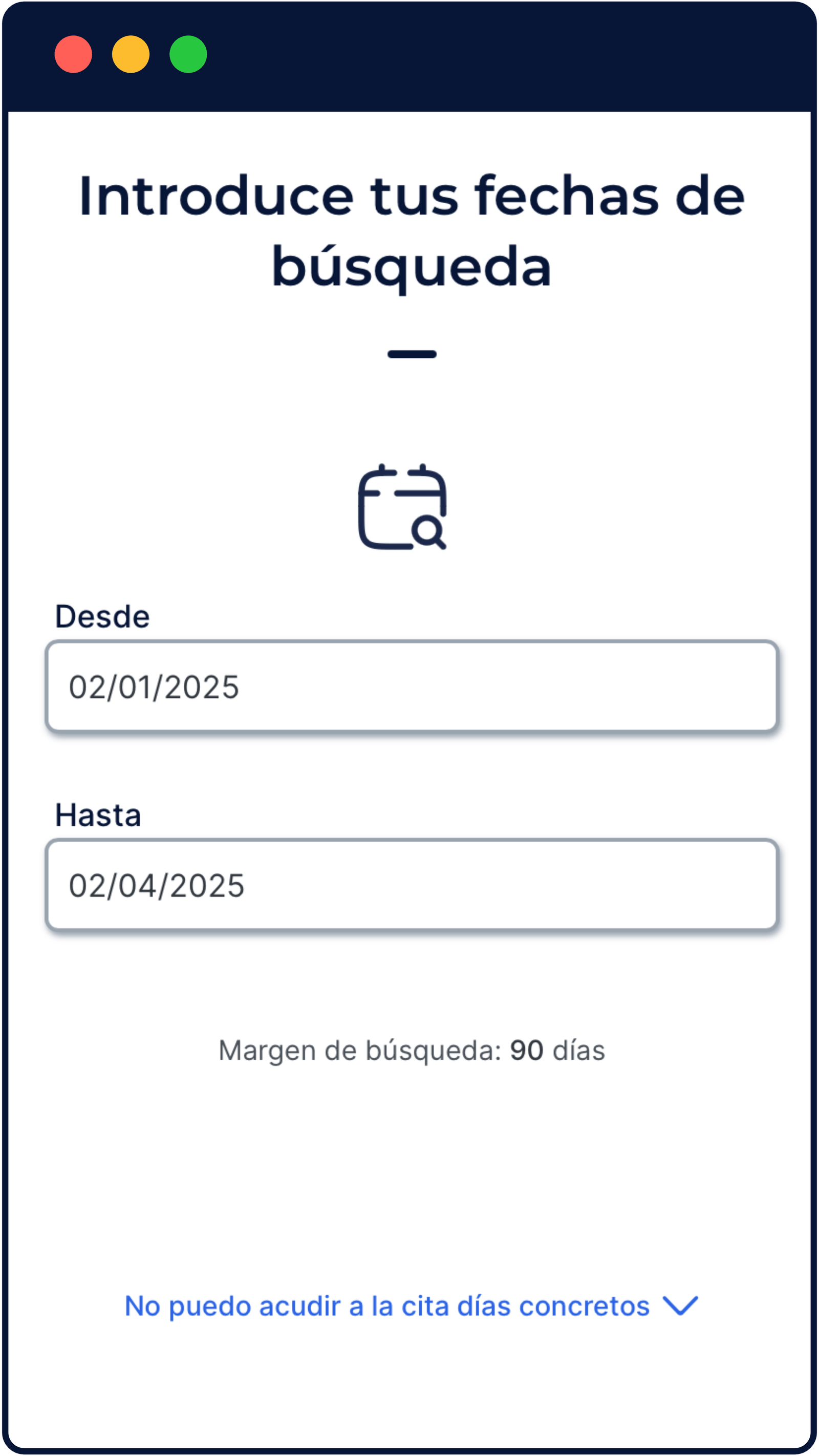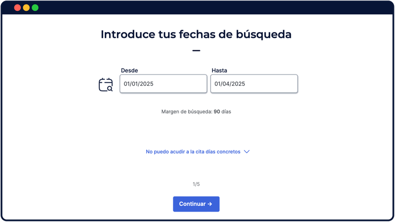 Una vez que has seleccionado la cita que deseas buscar, accederás al formulario en el que debes indicar las fechas de búsqueda. Selecciona las fechas que más se adecuen a tu disponibilidad para acudir a la oficina. Selecciona desde una fecha inicial hasta una fecha final en la que se realizará la reserva. Cuanta más amplio este rango, más probabilidades de poder reservar una cita